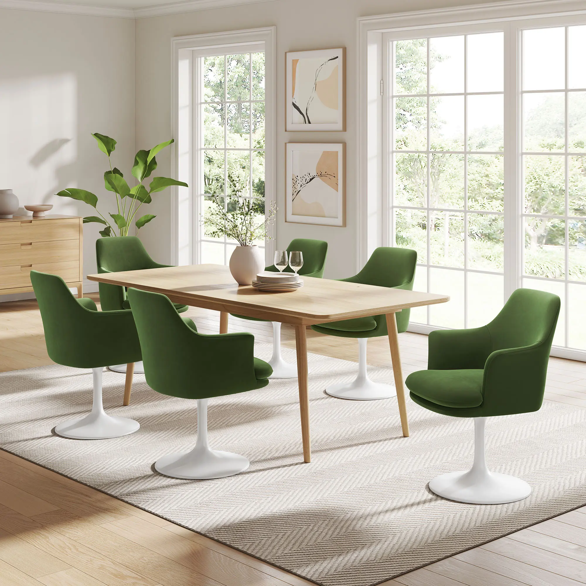 Embrace the day-to-day with the Lippa Velvet Swivel Dining Room Armchair. Upholstered in soft, stain-resistant performance velvet, this swivel armchair combines style and comfort and is perfect for everyday use. Resting on a tapered, metal pedestal base, the Lippa velvet dining armchair not only exudes modern elegance but also features a 360º swivel capability. Add to this its gracefully curved arms that flow into the backrest, and this pedestal swivel chair provides comfortable support, making it perfect for both casual dining and relaxed conversation. The removable and washable seat cushion, secured with velcro strips, adds practicality to the velvet swivel dining chair design, while a plastic rubber ring around the base protects floors from scratches. Not only an upholstered swivel dining chair, it also functions beautifully as an velvet office chair with arms, or even a chic velvet vanity chair. Whether complementing one of the Lippa dining room tables or your existing setup, this velvet swivel armchair with pedestal base naturally freshens up your space. Assembly Required. Swivel Dining Chair Weight Capacity: 300 lbs.