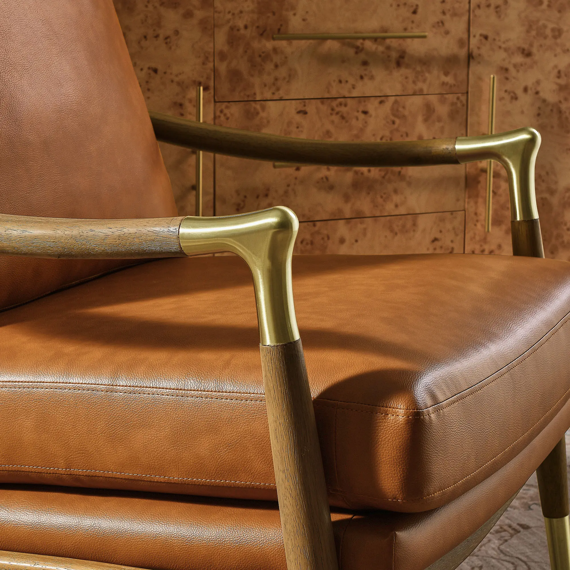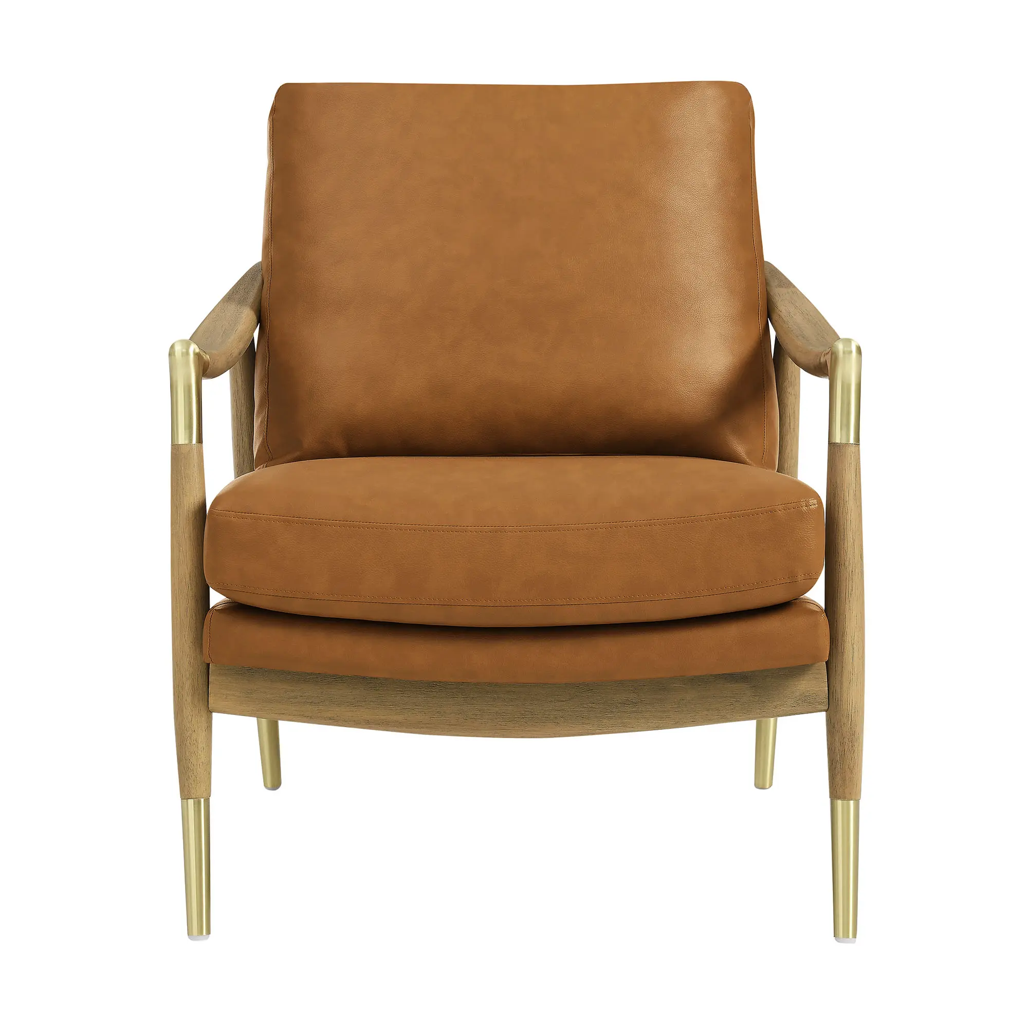 Enhance your living space with the Langford Vegan Leather Living Room Chair, where elegance meets comfort in a timeless mid-century modern design. Covered in sleek faux leather, this upholstered accent chair adds a sophisticated touch with its inviting, smooth texture and resilient finish. Brass accents on the legs and corners of the swooped armrests bring a refined charm, highlighting the sitting chair’s clean lines and classic structure. Crafted with a solid kiln-dried wood frame, the accent chair with arms is as durable as it is stylish, offering long-lasting support and comfort. Langford's cushions provide a consistent look and feel, ensuring this modern armchair remains as cozy as it is chic. Perfect for reading nooks, living rooms, or as a striking bedroom accent, the Langford Reading Nook Chair combines mid-century modern flair with modern functionality. Weight Capacity: 300 lbs.